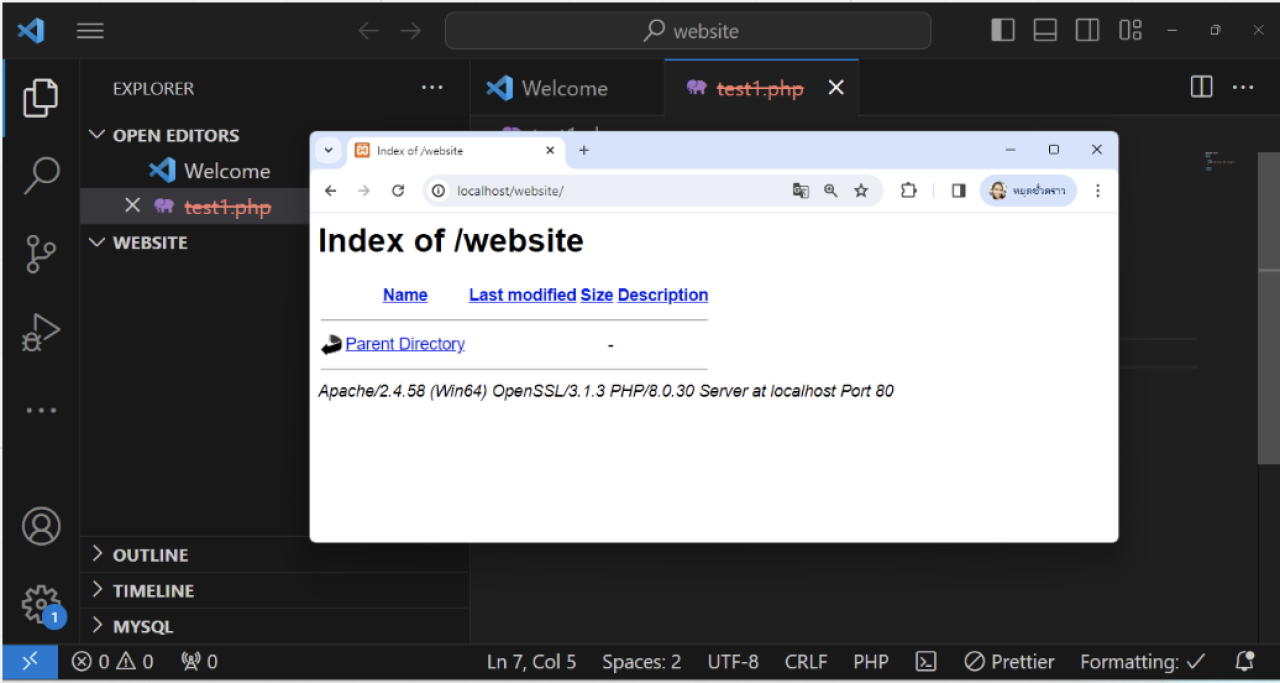 ตรวจสอบความสำเร็จในการสร้างโฟลเดอร์ชื่อว่า “Mywebsite” ในโฟลเดอร์ราก ทดสอบเข้าถึงไฟล์เอกสาร ในเว็บแอพพลิเคชั่นนี้จะเข้าถึงได้โดยใช้ยูอาร์แอล http://localhost/Mywebsite/ ดังรูปที่ 1.41