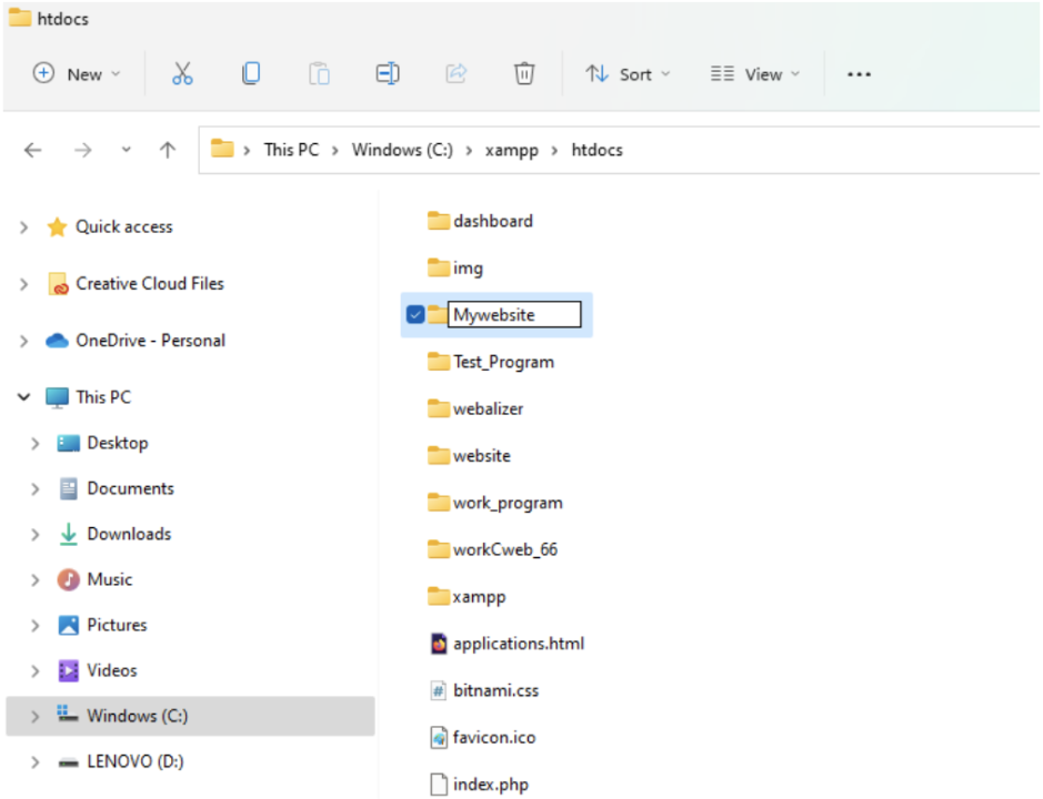 2. สร้างโฟลเดอร์ใหม่ชื่อว่า “Mywebsite” ไว้ในโฟลเดอร์ราก ดังรูปที่ 1.40