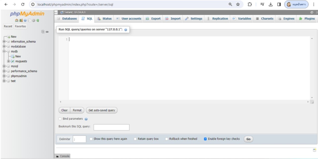 ในการทดสอบคําสั่งเอสคิวแอล มีหลายวิธีซึ่งที่สะดวกกับผู้พัฒนาในรายวิชานี้จะใช้วิธีการ ทดสอบคําสั่งผ่านโปรแกรม phpMyAdmin ซึ่งนักศึกษามีอยู่แล้ว การทดสอบคําสั่งทําได้โดยการเข้าไป ที่หน้าหลักของโปรแกรม เลือกฐานข้อมูล จากนั้นเลือกแท็บ SQL จะปรากฏช่องว่างสําหรับใส่รหัสคําสั่ง เอสคิวแอล ซึ่งหลังจากพิมพ์คําสั่งแล้วต้องการทดสอบให้คลิกที่ปุ่ม Go ดังรูปที่ 7.15