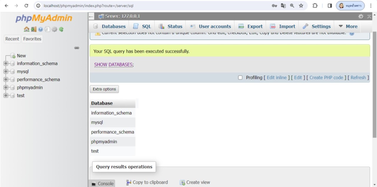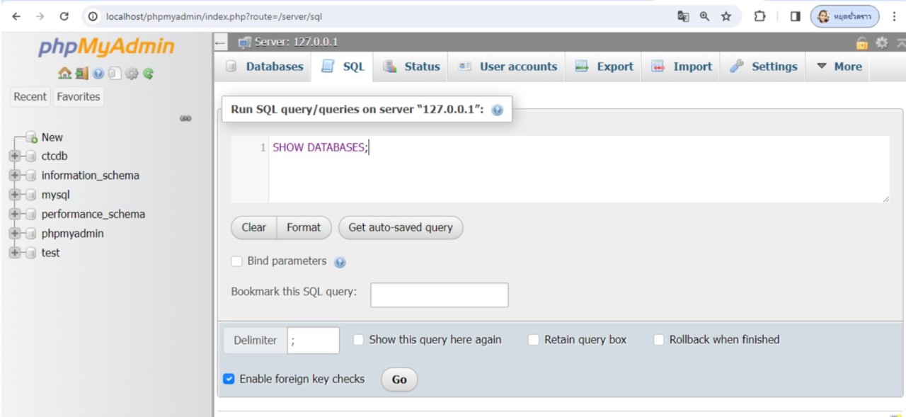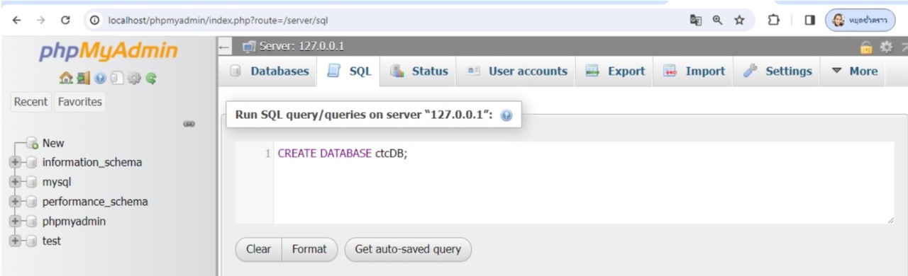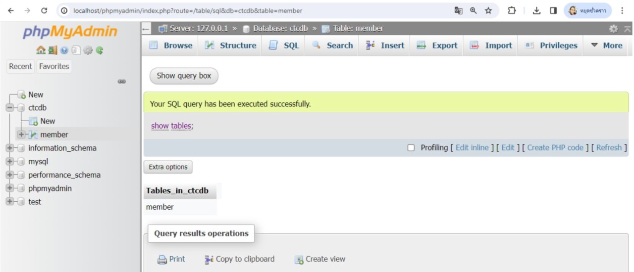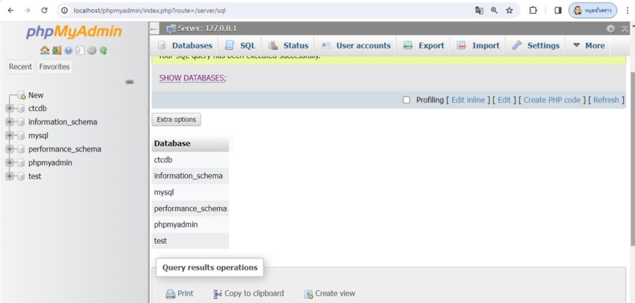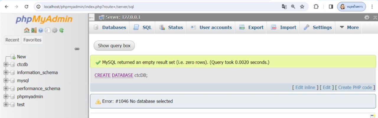 จะเห็นว่ารายชื่อฐานข้อมูลทั้งหมดที่แสดงหลังจากสร้างฐานข้อมูลใหม่ จะปรากฏรายชื่อฐานข้อมูล ctcdb ที่สร้างขึ้นใหม่ด้วย