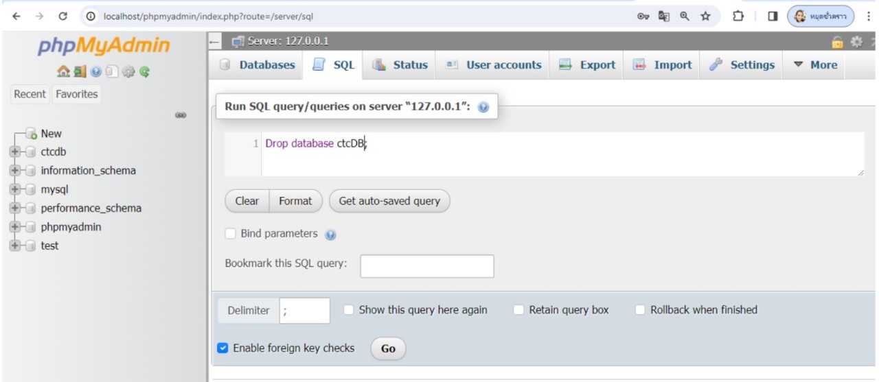 จะเห็นว่า รายชื่อฐานข้อมูลทั้งหมดที่แสดง หลังจากลบฐานข้อมูล ctcDB จะไม่ปรากฏรายชื่อฐานข้อมูลชื่อ ctcDB