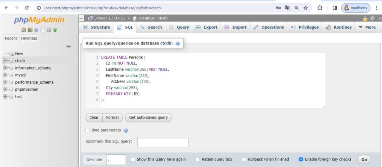 ทดสอบการใช้คำสั่งการสร้างตาราง ตามตัวอย่าง โดยทดสอบคําสั่งผ่านโปรแกรม phpMyAdmin การทดสอบคําสั่งทําได้โดยการเข้าไป ที่หน้าหลักของโปรแกรม จากนั้นเลือกแท็บ SQL