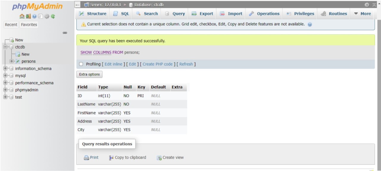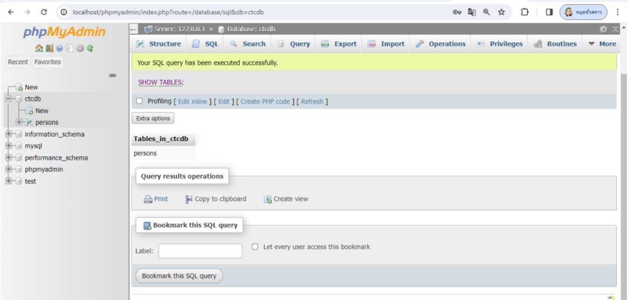 หลังจากพิมพ์คำสั่งสร้างตาราง Person เสร็จเรียบร้อยแล้ว ลองทดสอบดูว่าตาราง Person ได้ถูกสร้างอยู่ในฐานข้อมูลชื่อ ctcDB จริง ให้พิมพ์ Show tables; จะเห็นผลลัพธ์ตามตัวอย่าง