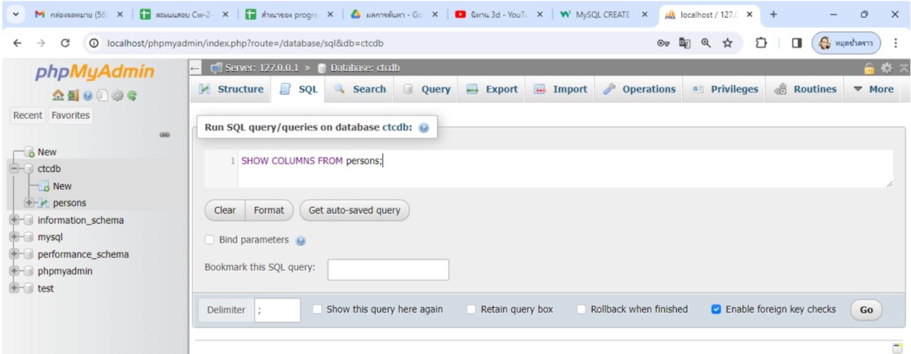 ทดสอบการใช้คำสั่งการแสดงรายละเอียดของตาราง โดยทดสอบคําสั่งผ่านโปรแกรม phpMyAdmin การทดสอบคําสั่งทําได้โดยการเข้าไป ที่หน้าหลักของโปรแกรมเลือกฐานข้อมูลที่ต้องการ ตามตัวอย่างให้เลือกฐานข้อมูลชื่อ ctcDB จากนั้นเลือกแท็บ SQL แล้วพิมพ์คำสั่งตามตัวอย่าง