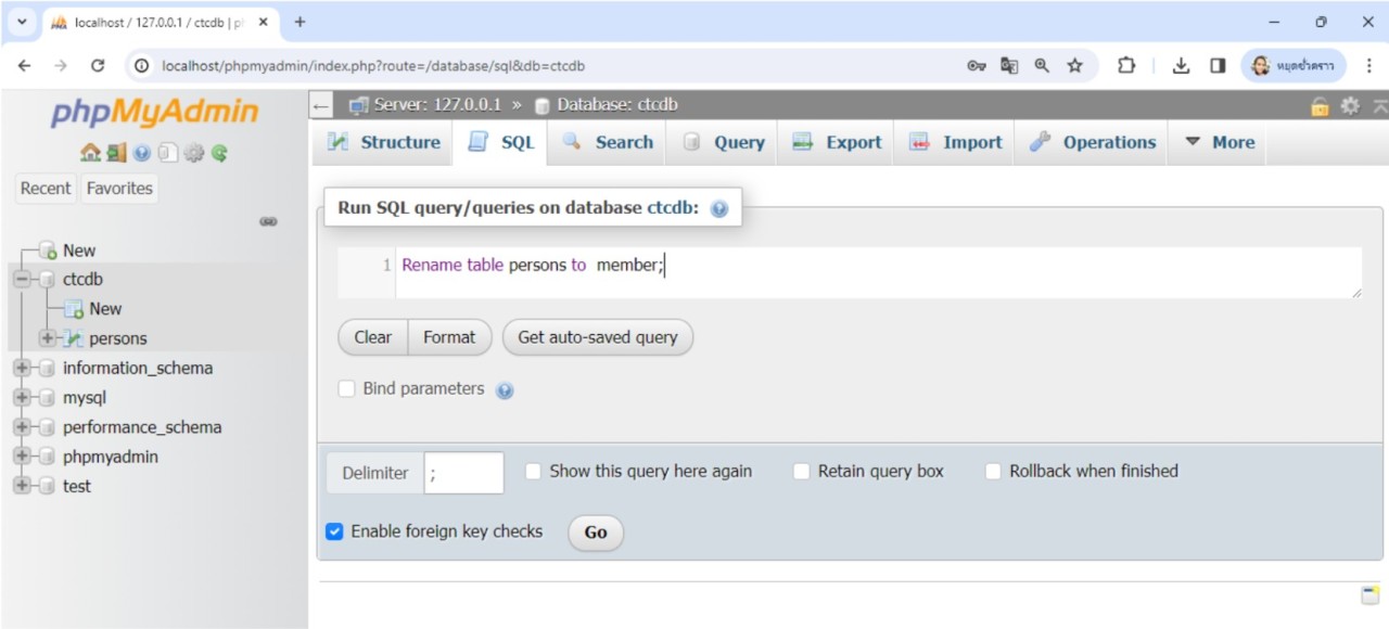 ทดสอบการใช้คำสั่งการเปลี่ยนชื่อตาราง โดยทดสอบคําสั่ง Rename table; ในตัวอย่างจะแก้ไขชื่อตารางจาก persons เป็น member โดยพิมพ์ตามคำสั่งตามรูปแบบคำสั่ง