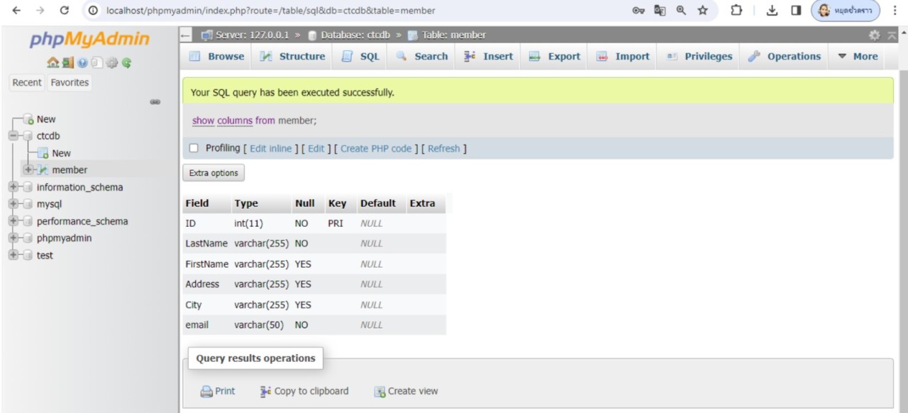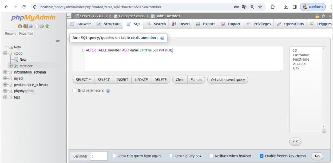 ทดสอบการใช้คำสั่งการเพิ่มขอบเขตข้อมูลในตาราง ในตัวอย่างเพิ่มฟิลด์ชื่อ email ในตาราง member