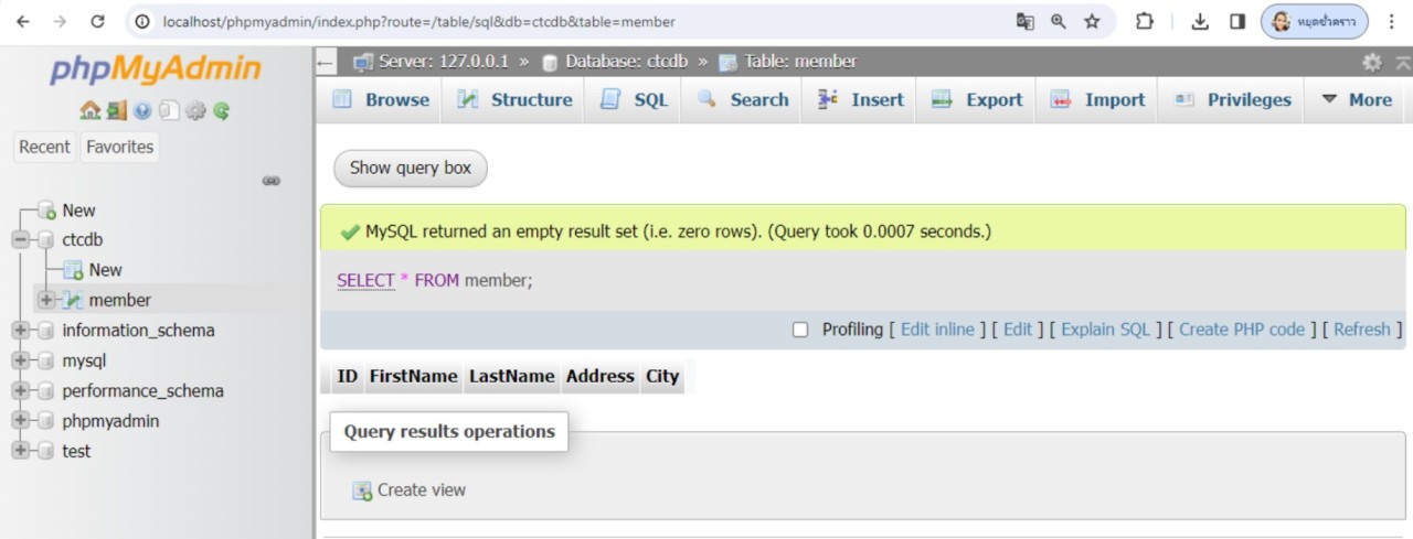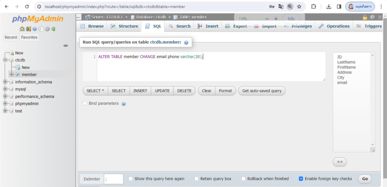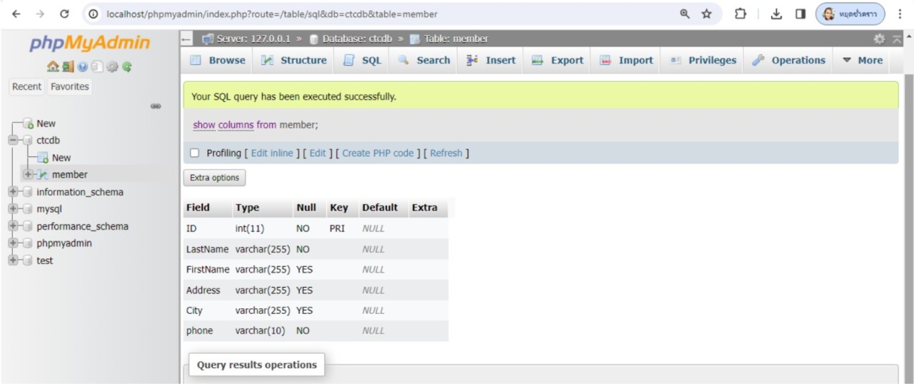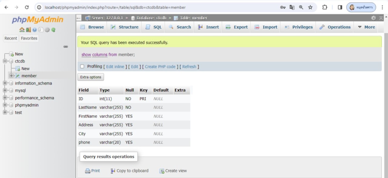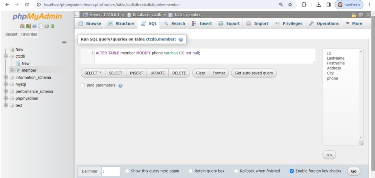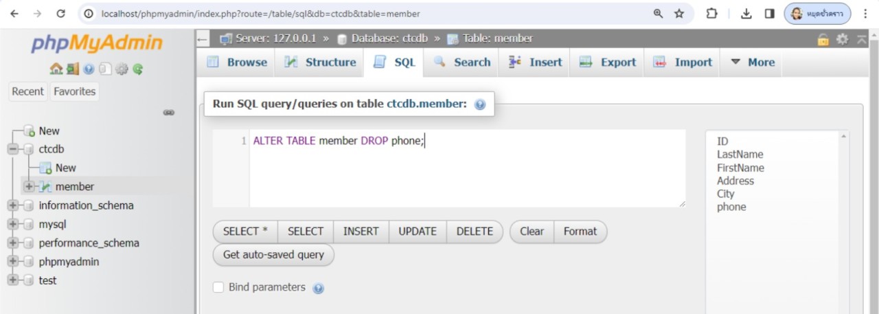 จะเห็นว่าไม่ขอบเขตข้อมูลชื่อ phone ในตาราง member แล้ว
