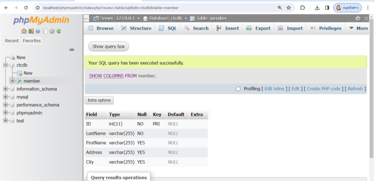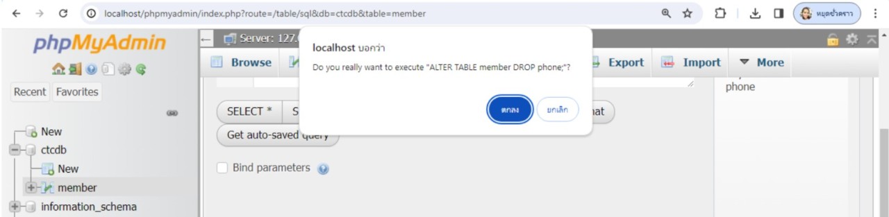 เมื่อทำการคลิกปุ่ม ตกลง ก็จะทำการลบขอบเขตข้อมูลชื่อ phone ออกสำเร็จ เพื่อทดสอบว่าขอบเขตข้อมูลชื่อ phone ได้ถูกลบออกจริง ให้ใช้คำสั่ง show columns from member; เพื่อดูรายละเอียดผลลัพธ์