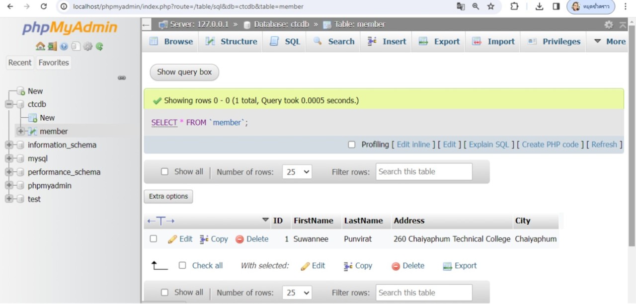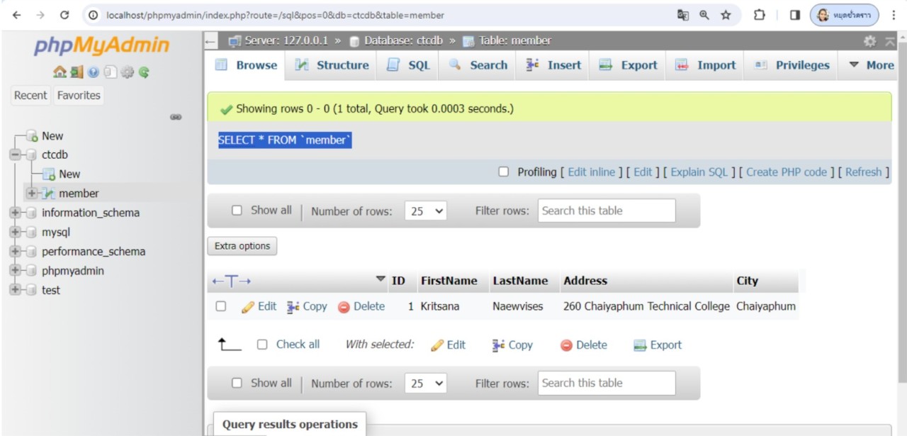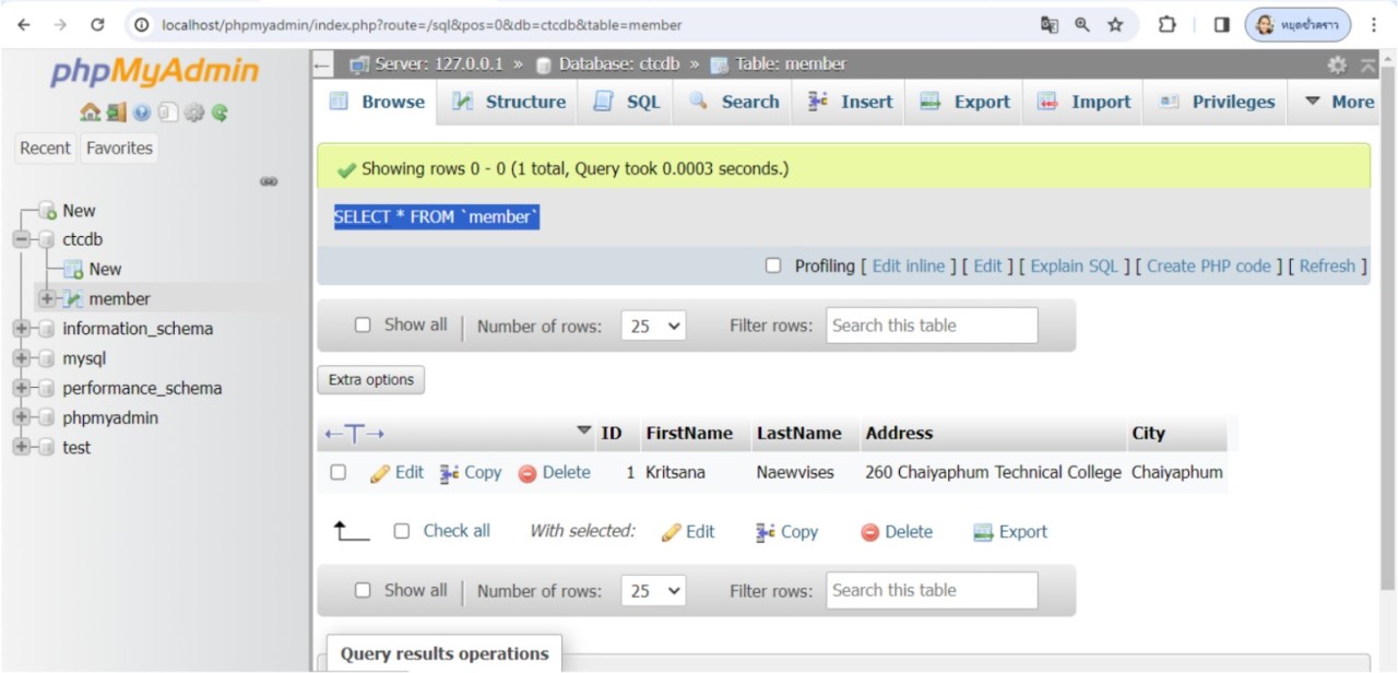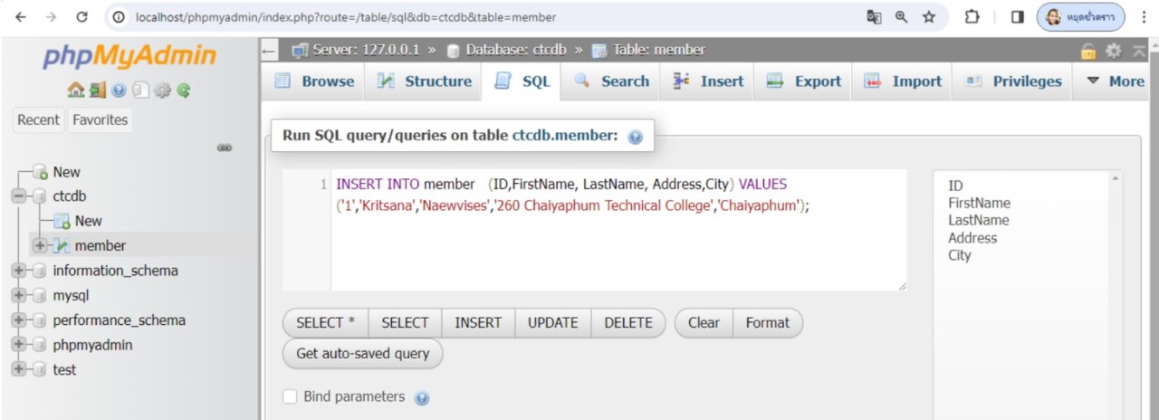จากตัวอย่าง เมื่อเพิ่มข้อมูลลงในตารางสำเร็จแล้ว เพื่อทดสอบว่าข้อมูลได้ถูกเพิ่มจริง ให้ใช้คำสั่ง SELECT * FROM 'member' เพื่อดึงข้อมูลทั้งหมดจากตาราง member ขึ้นมาแสดงจะเห็นว่าข้อมูลได้ถูกเพิ่มลงในตาราง member จริง