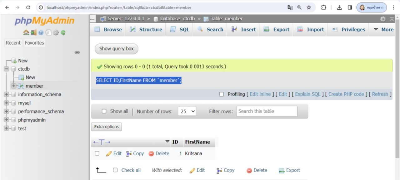 หรือต้องการแสดงข้อมูลแบบระบุคอลัมน์ โดยแสดงข้อมูลในคอลัมน์ id กับ FirstName จะใช้คำสั่ง SELECT ID,FirstName FROM 'member'; ผลลัพธ์ที่ได้จะปรากฏดังนี้