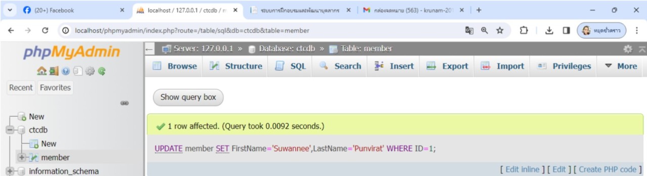 จากตัวอย่าง เมื่อแก้ไขข้อมูลในตารางสำเร็จแล้ว เพื่อทดสอบว่าข้อมูลได้ถูกเพิ่มจริง ให้ ใช้คำสั่ง SELECT * FROM 'member' เพื่อดึงข้อมูลทั้งหมดจากตาราง member ขึ้นมาแสดงจะเห็นว่าข้อมูลได้ถูกแก้ไข จริง