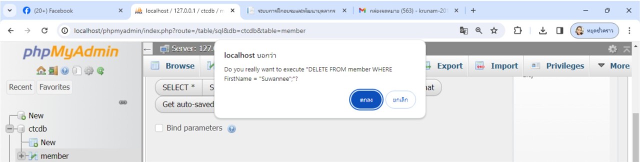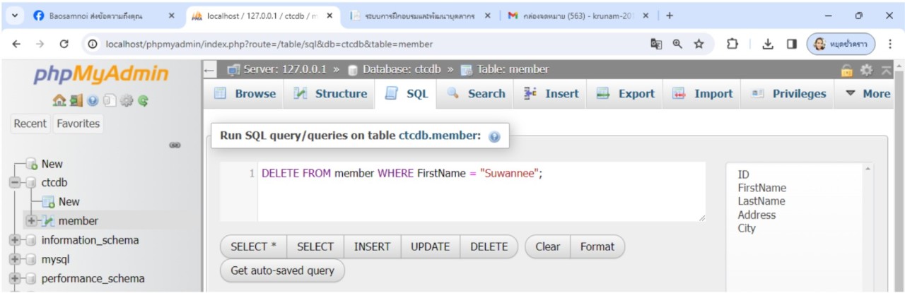 ในตัวอย่างนี้ต้องการลบข้อมูลสมาชิก ชื่อ Suwannee จะใช้คำสั่งดังนี้