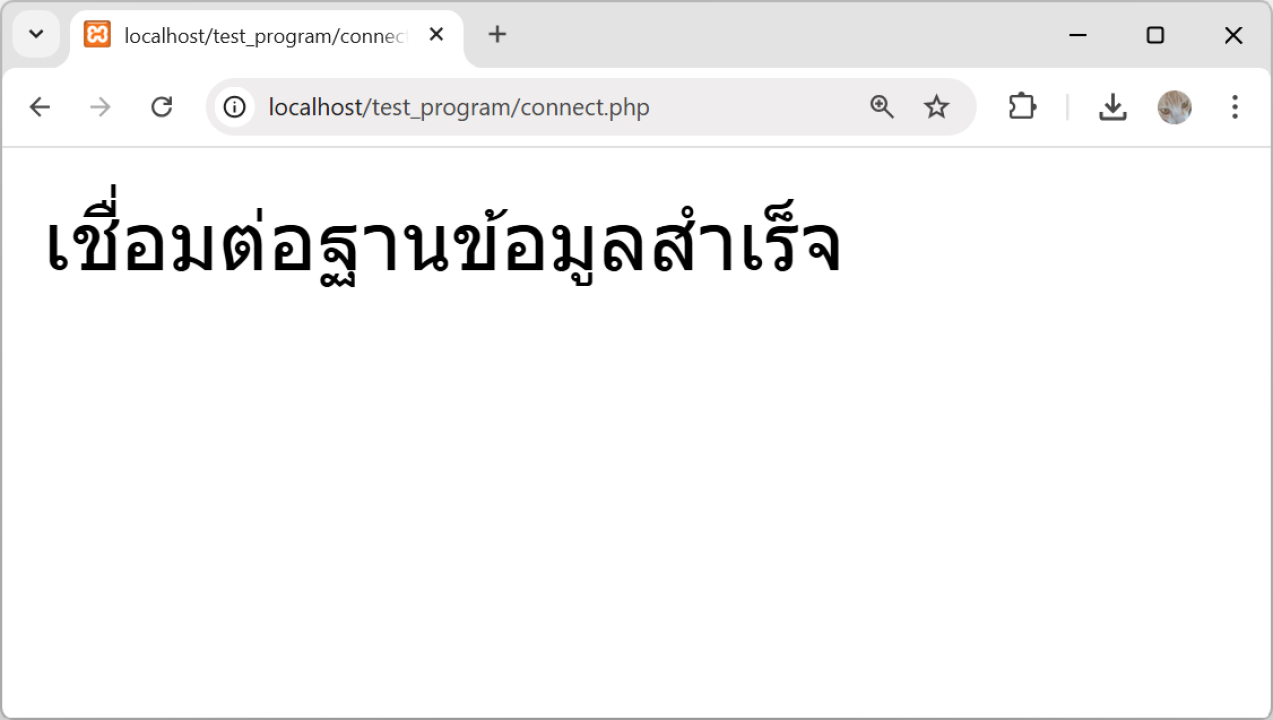 ทดสอบการทำงาน เปิด Web Browser พิมพ์ localhost/Test_Program/connect.php หากเชื่อมต่อฐานข้อมูลสำเร็จจะแสดงหน้าจอดังรูปภาพ