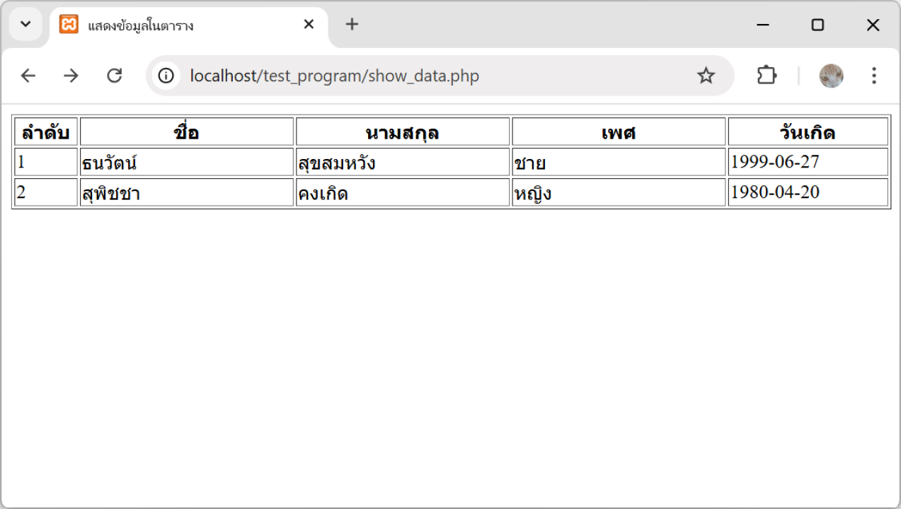 เขียนโปรแกรมภาษาพีเอชพีแสดงข้อมูลในตาราง ตามตัวอย่าง แล้วบันทึกไฟล์ชื่อ show_data.php สามารถเขียนโปรแกรมได้ดังนี้