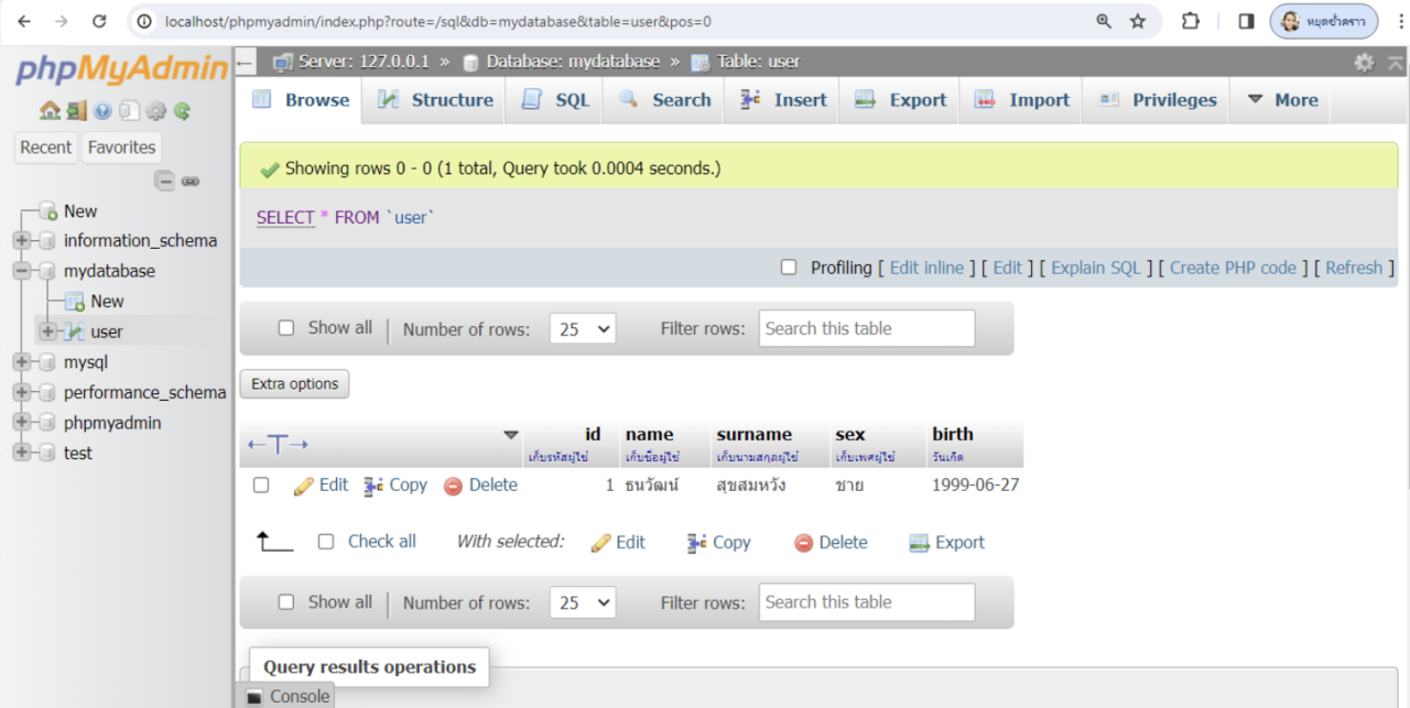 4. ตรวจสอบใน localhost/phpmyadmin จะพบข้อมูลเฉพาะรหัสผู้ใช้งานลำดับที่ 1 เท่านั้น