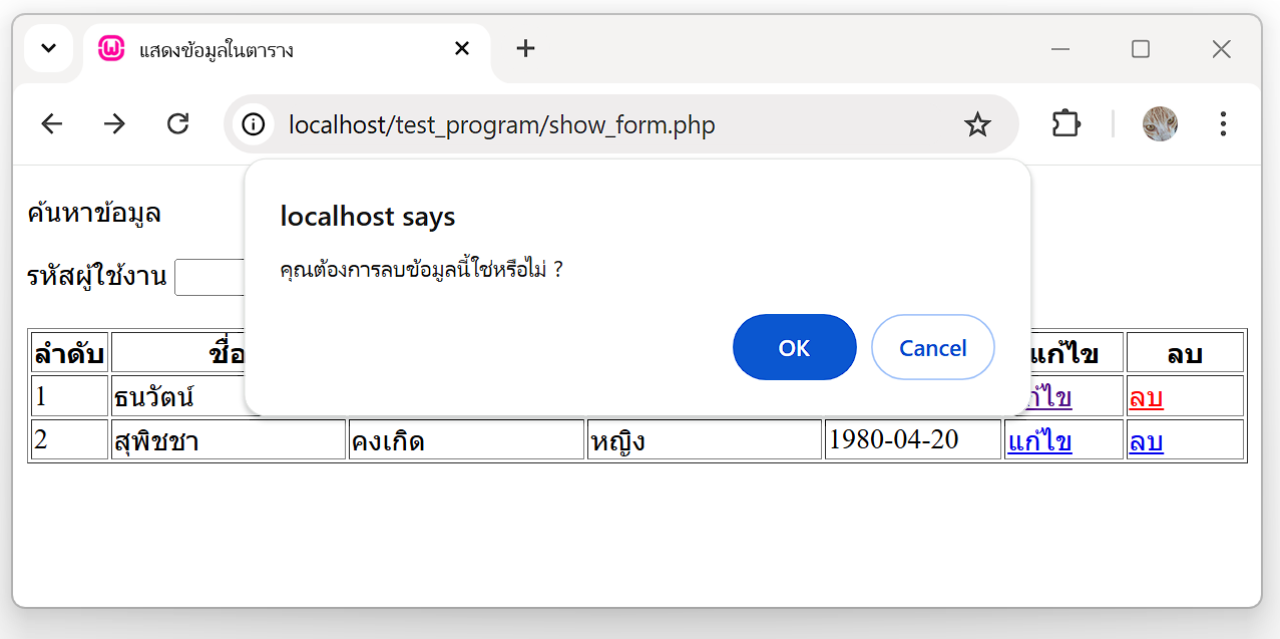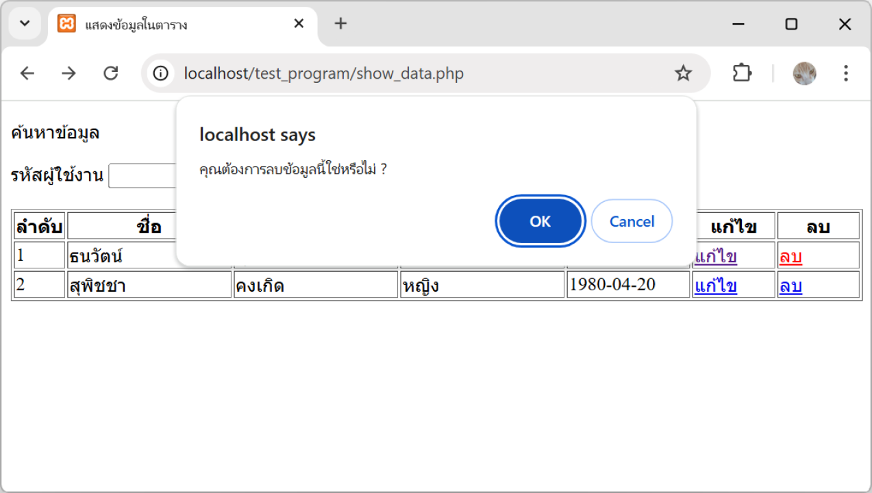 1. ทดสอบการทำงาน เปิด Web Browser พิมพ์ localhost/Test_Program/show_data.php จะแสดงหน้าจอดังรูปภาพ ทำการลบข้อมูล โดยคลิกลบ ข้อมูลผู้ใช้ลำดับที่ 2 จะปรากฏกล่องยืนยันก่อนลบข้อมูล หารคลิกที่ปุ่มยกเลิก ข้อมูลผู้ใช้ลำดับที่ 2 จะไม่ถูกลบ แต่ถ้าคลิกปุ่ม ตกลง ข้อมูลผู้ใช้ลำดับที่ 2 จะถูกส่งไปหน้าสำหรับลบข้อมูลผู้ใช้งาน (delete_user.php) และทำการลบข้อมูล ผู้ใช้ลำดับที่ 2