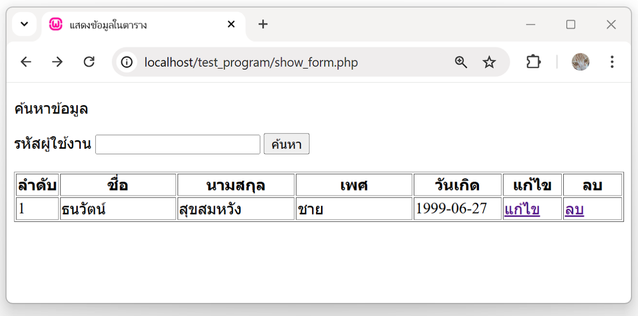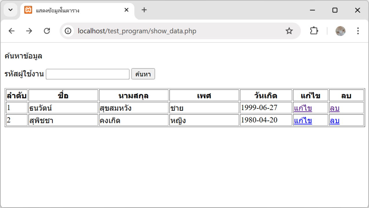 3. เมื่อเปิด Web Browser localhost/Test_Program/show_data.php อีกครั้ง ข้อมูล ผู้ใช้ลำดับที่ 2 จะไม่แสดงในตาราง จะแสดงหน้าจอดังรูปภาพ